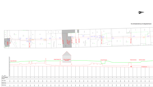 Schachtbauwerk / im Kanal mit Grundriss – Längsschnitt – Querprofil